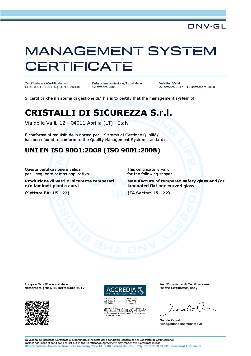 Dal 2001 Vetritalia ha un sistema di gestione della qualità certificato ISO 9001 dal DNV.